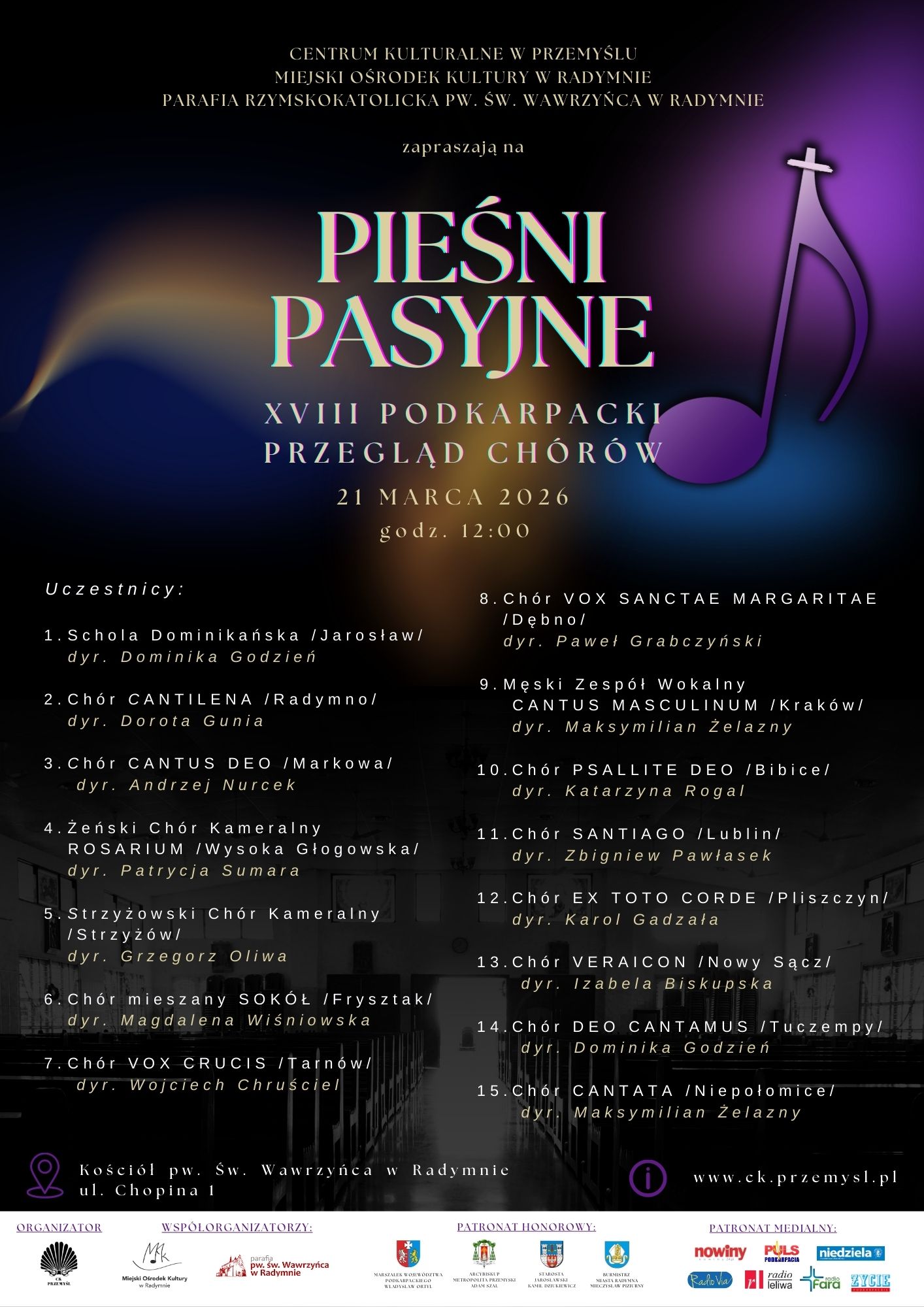 Centrum Kulturalne w Przemyślu, we współpracy z Miejskim Ośrodkiem Kultury w Radymnie oraz Parafią Rzymskokatolicką w Radymnie, ma zaszczyt zaprosić Państwa do udziału w XVIII Podkarpackim Przeglądzie Chórów „Pieśni Pasyjne”.