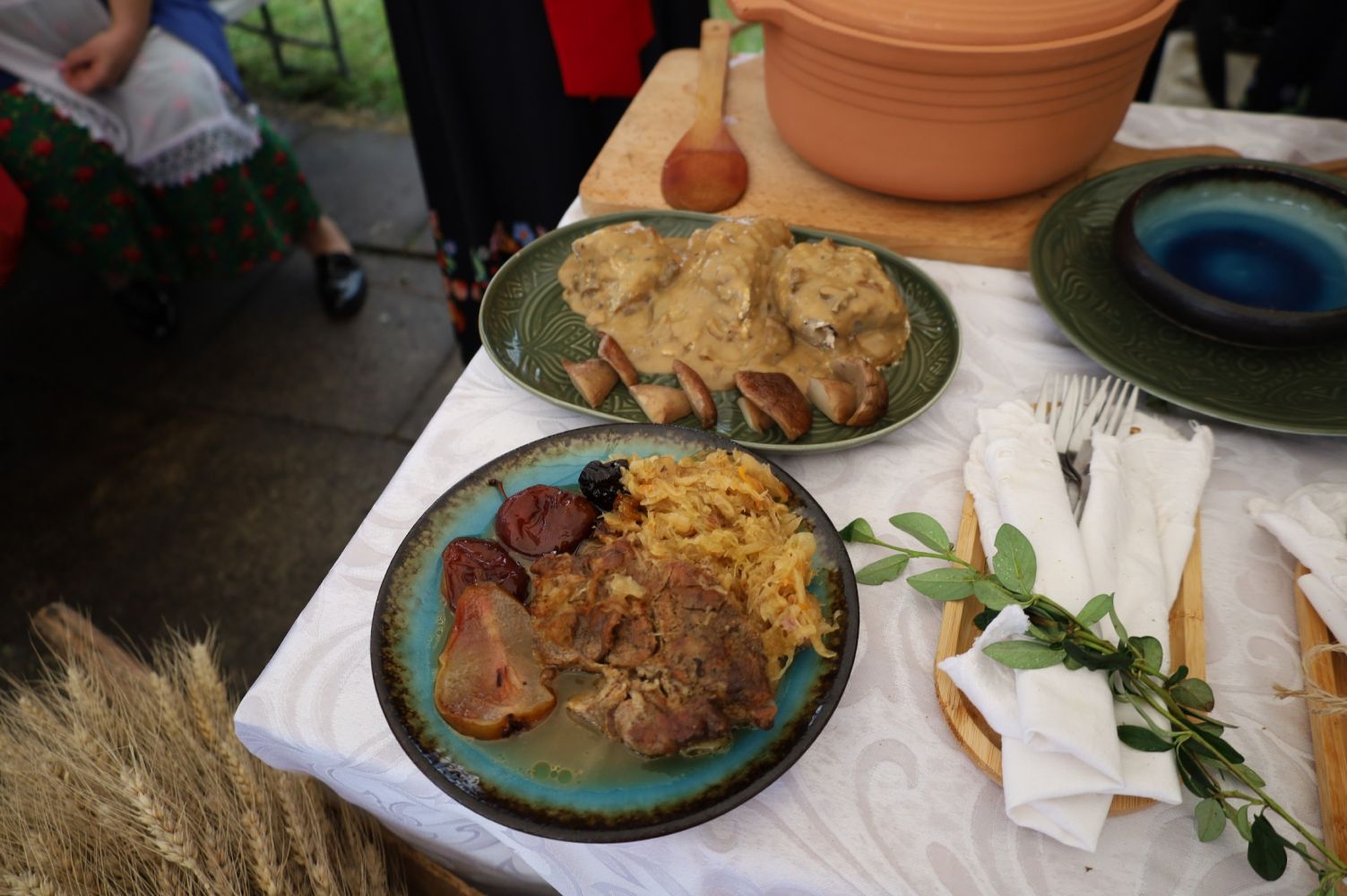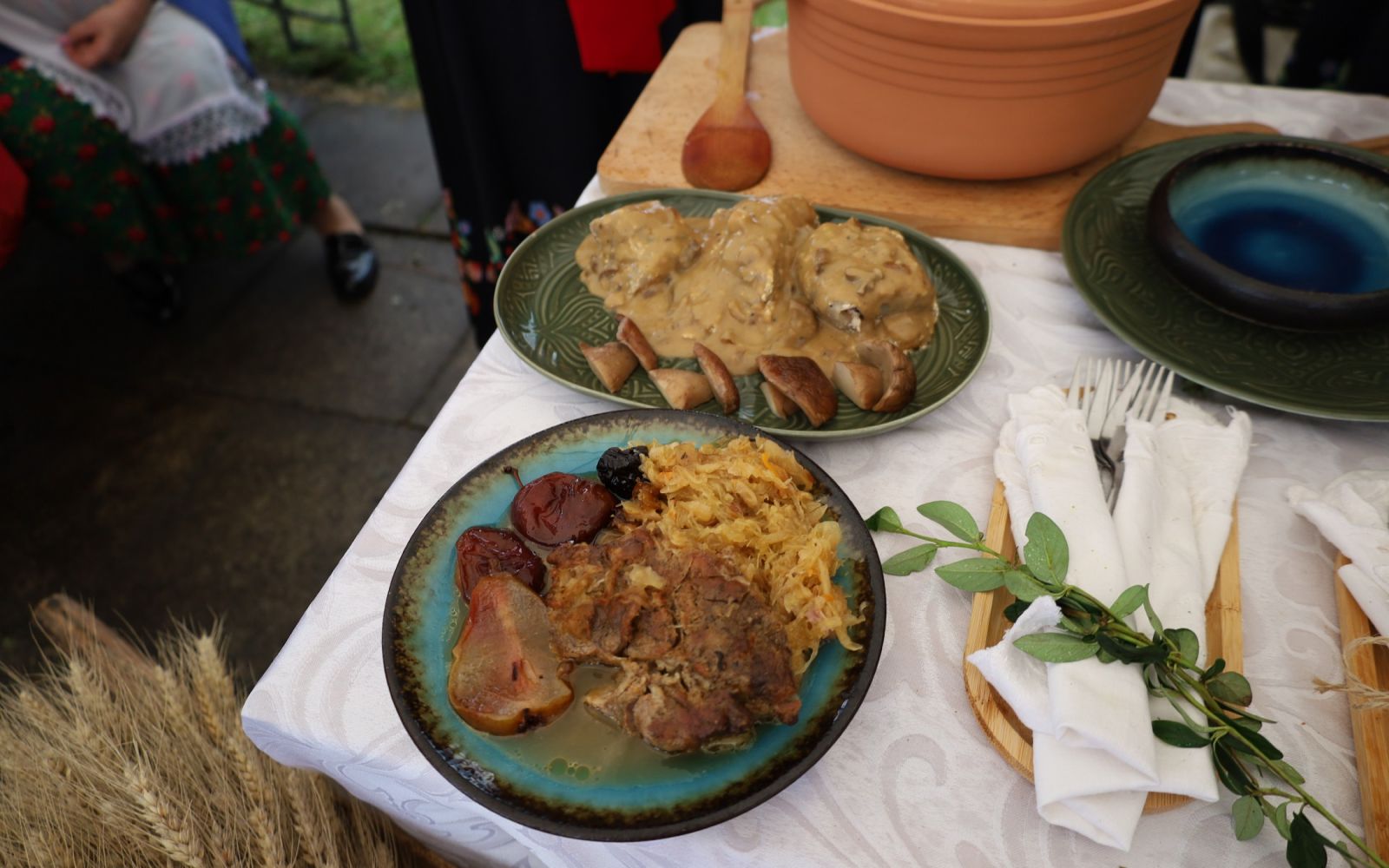 Konkurs kulinarny, KGW w Zagórzu, potrawy konkursowe: gołąbki z ziemniaków z sosem z leśnych grzybów, świnina w kapuście, fot. CK Przemyśl.