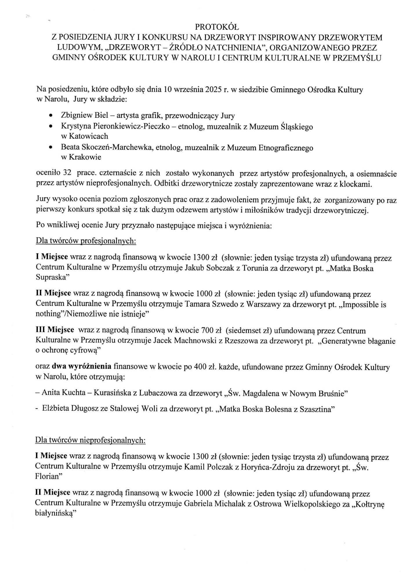Na posiedzeniu, które odbyło się dnia 10 września 2025 r. w siedzibie Gminnego Ośrodka Kultury w Narolu, Jury w składzie: