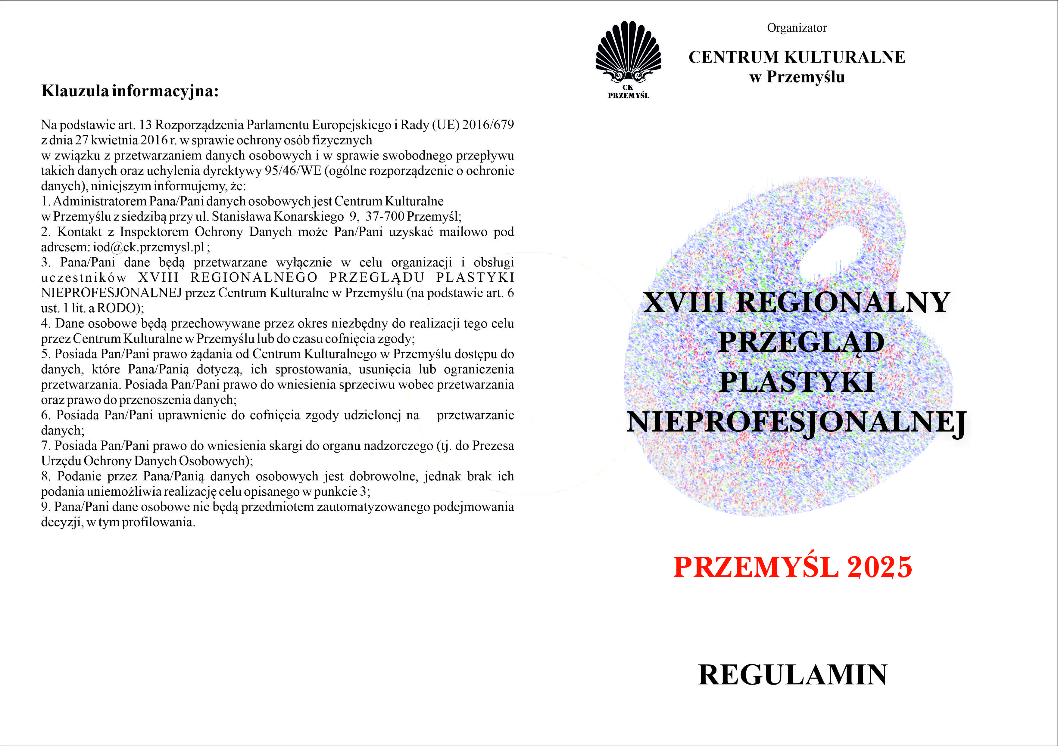 Prace winny być przygotowane do ekspozycji wraz z dokładną informacją zamieszczoną z tyłu pracy: imię i nazwisko autora, adres, tytuł pracy, technika, rok powstania.